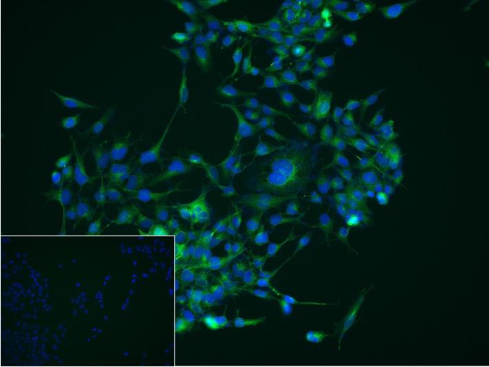 4% Paraformaldehyde-fixed A673 (H) cell; Triton X-100 at r.t. for 20 min; Antibody incubation with (FADS1) monoclonal Antibody, unconjugated (bsm-62440R) 1:100, 90 min at 37°C; followed by conjugated Goat Anti-Rabbit IgG antibody (green, bs-40295G-FITC) at 37°C for 90 min, DAPI (blue, C02-04002) was used to stain the cell nuclei. PBS instead of the primary antibody was used as the blank control.