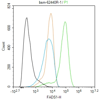 The A673 (H) cells were fixed with 4% PFA (10 min at r.t.) and then permeabilized with 90% ice-cold methanol for 20 min at -20℃,the cells then were incubated in 5%BSA to block non-specific protein-protein interactions (30 min at r.t.).Primary Antibody (green):Rabbit Anti-FADS1 antibody (bsm-62440R): 1 μg/10^6 cells; Secondary Antibody (white blue): Goat anti-Rabbit IgG-FITC (bs-40295G-FITC): 1 μg/test. Isotype Control (orange): Rabbit IgG (bs-0295P). Blank control (black): PBS. Acquisition of 20,000 events was performed.