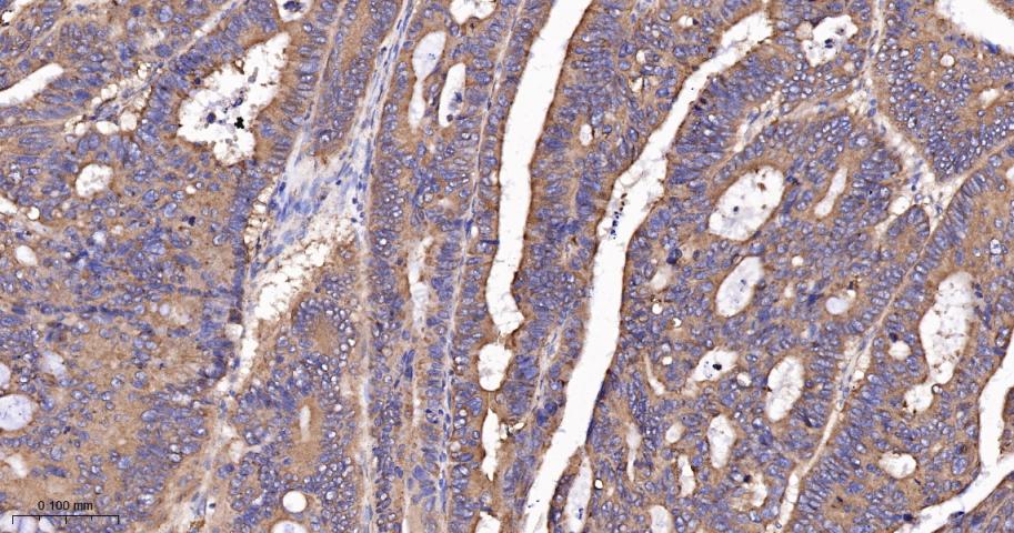 Paraformaldehyde-fixed, paraffin embedded Human Colon Cancer; Antigen retrieval by boiling in sodium citrate buffer (pH6.0) for 15 min; The section was incubated with FADS1 Monoclonal Antibody, Unconjugated (bsm-62440R) at 1:200 overnight at 4°C, followed by conjugation to the bs-0295G-HRP and DAB (C-0010) staining.