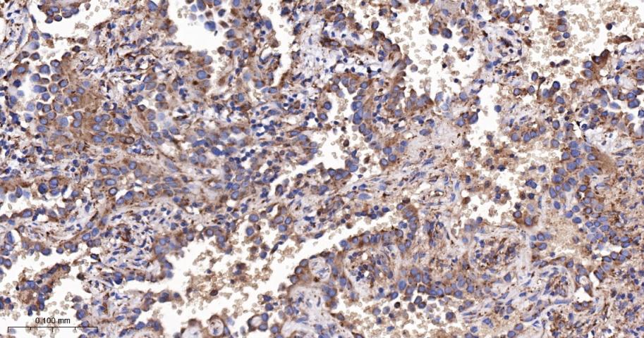 Paraformaldehyde-fixed, paraffin embedded Human Lung Cancer; Antigen retrieval by boiling in sodium citrate buffer (pH6.0) for 15 min; The section was incubated with FADS1 Monoclonal Antibody, Unconjugated (bsm-62440R) at 1:200 overnight at 4°C, followed by conjugation to the bs-0295G-HRP and DAB (C-0010) staining.
