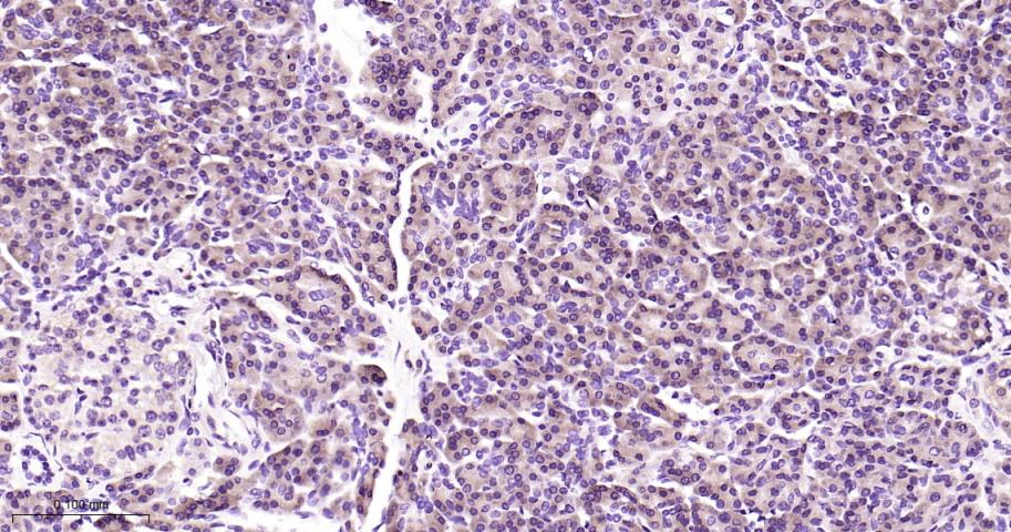 Paraformaldehyde-fixed, paraffin embedded Human Pancreas; Antigen retrieval by boiling in sodium citrate buffer (pH6.0) for 15 min; Antibody incubation with CARS1 Monoclonal Antibody, Unconjugated(bsm-62444R) at 1:200 overnight at 4°C, followed by conjugation to the bs-0295G-HRP and DAB (C-0010) staining.