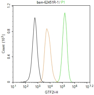 The Hela (H) cells were fixed with 4% PFA (10 min at r.t.) and then permeabilized with 90% ice-cold methanol for 20 min at -20℃,the cells then were incubated in 5%BSA to block non-specific protein-protein interactions (30 min at r.t.), followed by secondary antibody incubation for 40 min at room temperature. Primary Antibody (green):Rabbit Anti-GTF2I antibody (bsm-62451R,1:100); Isotype Control (orange): Rabbit IgG (bs-0295P). Blank control (black): PBS. Acquisition of 20,000 events was performed.