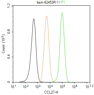 The A431 (H) cells were fixed with 4% PFA (10 min at r.t.) and then permeabilized with 90% ice-cold methanol for 20 min at -20℃,the cells then were incubated in 5%BSA to block non-specific protein-protein interactions (30 min at r.t.), followed by secondary antibody incubation for 40 min at room temperature. Primary Antibody (green):Rabbit Anti-CCL27 antibody (bsm-62453R,1:100); Isotype Control (orange): Rabbit IgG (bs-0295P). Blank control (black): PBS. Acquisition of 20,000 events was performed.