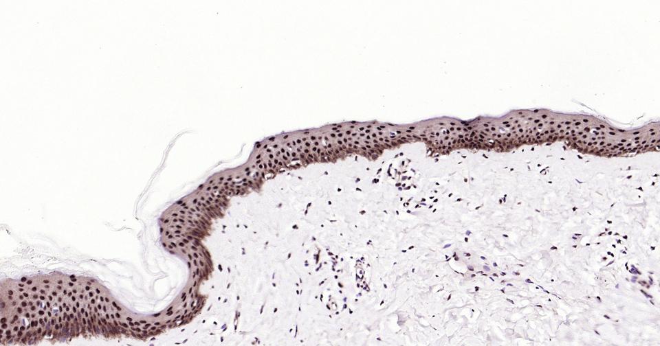 Paraformaldehyde-fixed, paraffin embedded Human Skin; Antigen retrieval by boiling in sodium citrate buffer (pH6.0) for 15 min; Antibody incubation with OLIG3 Monoclonal Antibody, Unconjugated(bsm-62456R) at 1:200 overnight at 4°C, followed by conjugation to the bs-0295G-HRP and DAB (C-0010) staining.