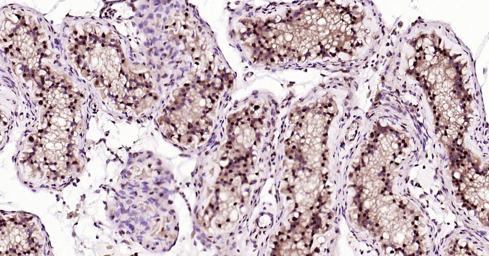 Paraformaldehyde-fixed, paraffin embedded Human Testicles; Antigen retrieval by boiling in sodium citrate buffer (pH6.0) for 15 min; Antibody incubation with OLIG3 Monoclonal Antibody, Unconjugated(bsm-62456R) at 1:200 overnight at 4°C, followed by conjugation to the bs-0295G-HRP and DAB (C-0010) staining.