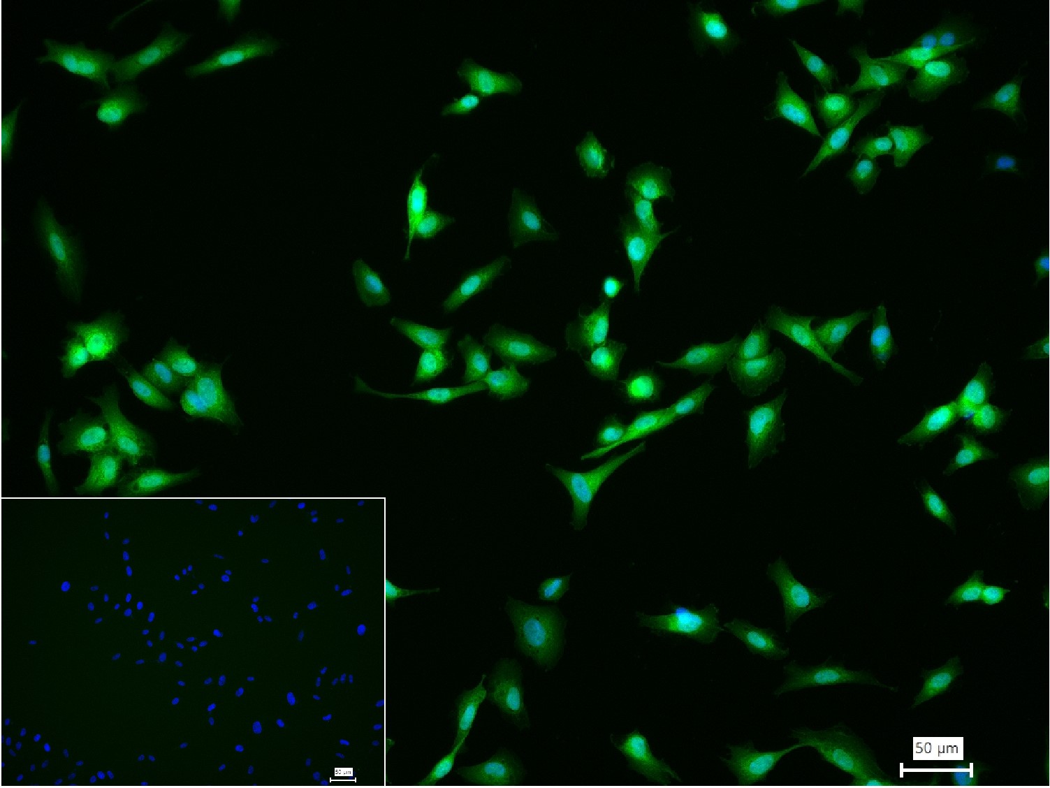 4% Paraformaldehyde-fixed U-87MG (H) cell; Triton X-100 at r.t. for 20 min; Antibody incubation with (OLIG3) monoclonal Antibody, unconjugated (bsm-62456R) 1:100, 90 min at 37°C; followed by conjugated Goat Anti-Rabbit IgG antibody (green, bs-40295G-FITC) at 37°C for 90 min, DAPI (blue, C02-04002) was used to stain the cell nuclei. PBS instead of the primary antibody was used as the blank control.