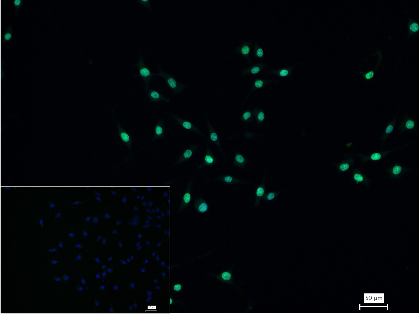 4% Paraformaldehyde-fixed SH-SY5Y(H) cell; Triton X-100 at r.t. for 20 min; Antibody incubation with (Acetyl-Histone H3.1 (Lys28)) monoclonal Antibody, unconjugated (bsm-62460R) 1:100, 90 min at 37°C; followed by conjugated Goat Anti-Rabbit IgG antibody (green, bs-60295G-FITC) at 37°C for 90 min, DAPI (blue, C02-04002) was used to stain the cell nuclei. PBS instead of the primary antibody was used as the blank control.