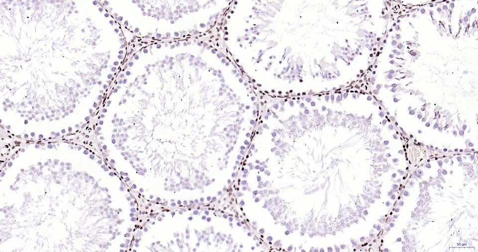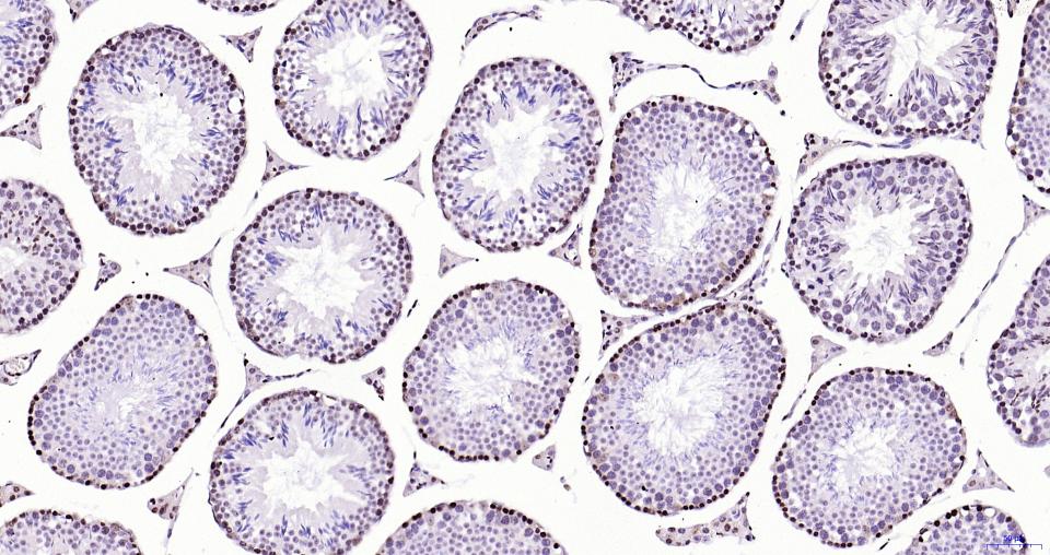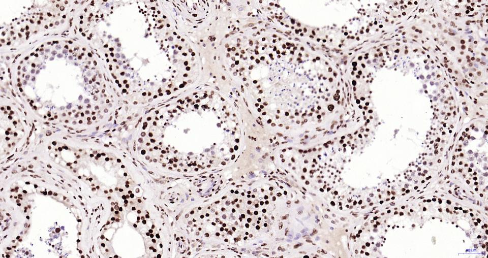 Paraformaldehyde-fixed, paraffin embedded Rat testicles; Antigen retrieval by boiling in sodium citrate buffer (pH6.0) for 15 min; Antibody incubation with Acetyl-Histone H3.1 (Lys28) Monoclonal Antibody, Unconjugated(bsm-62460R) at 1:200 overnight at 4°C, followed by conjugation to the SP Kit(Rabbit, SP-0023) and DAB (C-0010) staining.
