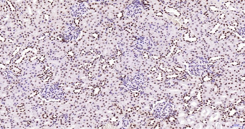 Paraformaldehyde-fixed, paraffin embedded Rat kidney; Antigen retrieval by boiling in sodium citrate buffer (pH6.0) for 15 min; Antibody incubation with Acetyl-Histone H3.1 (Lys28) Monoclonal Antibody, Unconjugated(bsm-62460R) at 1:200 overnight at 4°C, followed by conjugation to the SP Kit(Rabbit, SP-0023) and DAB (C-0010) staining.