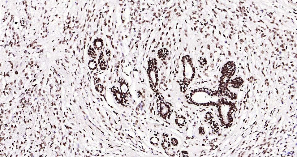 Paraformaldehyde-fixed, paraffin embedded Human Breast Cancer; Antigen retrieval by boiling in sodium citrate buffer (pH6.0) for 15 min; Antibody incubation with Acetyl-Histone H3.1 (Lys28) Monoclonal Antibody, Unconjugated(bsm-62460R) at 1:200 overnight at 4°C, followed by conjugation to the SP Kit(Rabbit, SP-0023) and DAB (C-0010) staining.