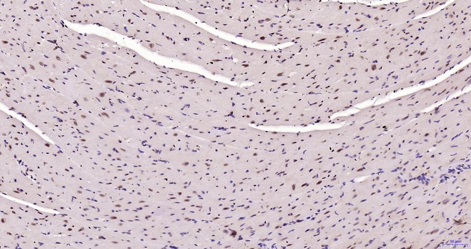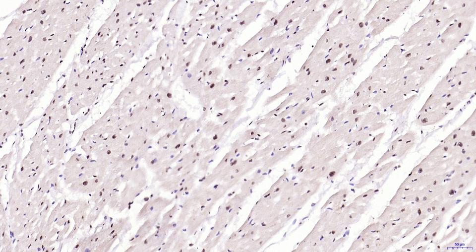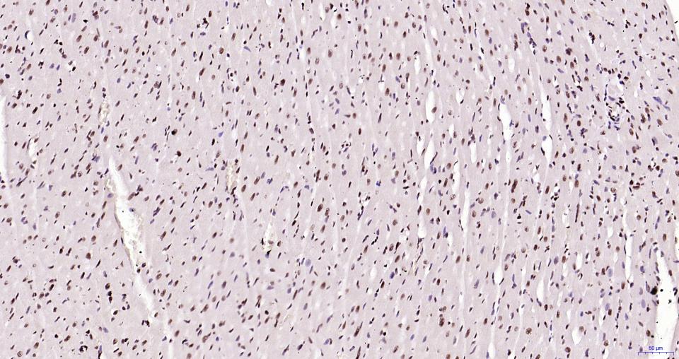 Paraformaldehyde-fixed, paraffin embedded Rat heart; Antigen retrieval by boiling in sodium citrate buffer (pH6.0) for 15 min; Antibody incubation with Acetyl-Histone H3.1 (Lys28) Monoclonal Antibody, Unconjugated(bsm-62460R) at 1:200 overnight at 4°C, followed by conjugation to the SP Kit(Rabbit, SP-0023) and DAB (C-0010) staining.
