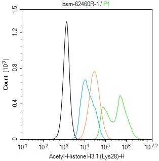 The HepG2 (H) cells were fixed with 4% PFA (10 min at r.t.) and then permeabilized with 90% ice-cold methanol for 20 min at -20℃,the cells then were incubated in 5%BSA to block non-specific protein-protein interactions (30 min at r.t.).Primary Antibody (green):Rabbit Anti-Acetyl-Histone H3.1 (Lys28) antibody (bsm-62460R,1:100); Secondary Antibody (white blue): Goat anti-Rabbit IgG-BF488 (bs-60295G-BF488): 1 μg/test. Isotype Control (orange): Rabbit IgG (bs-0295P). Blank control (black): PBS. Acquisition of 20,000 events was performed.