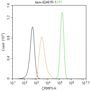 The SH-SY5Y (H) cells were fixed with 4% PFA (10 min at r.t.) and then permeabilized with 90% ice-cold methanol for 20 min at -20℃,the cells then were incubated in 5%BSA to block non-specific protein-protein interactions (30 min at r.t.), followed by secondary antibody incubation for 40 min at room temperature. Primary Antibody (green):Rabbit Anti-CRMP3 antibody (bsm-62461R,1:100); Isotype Control (orange): Rabbit IgG (bs-0295P). Blank control (black): PBS. Acquisition of 20,000 events was performed.