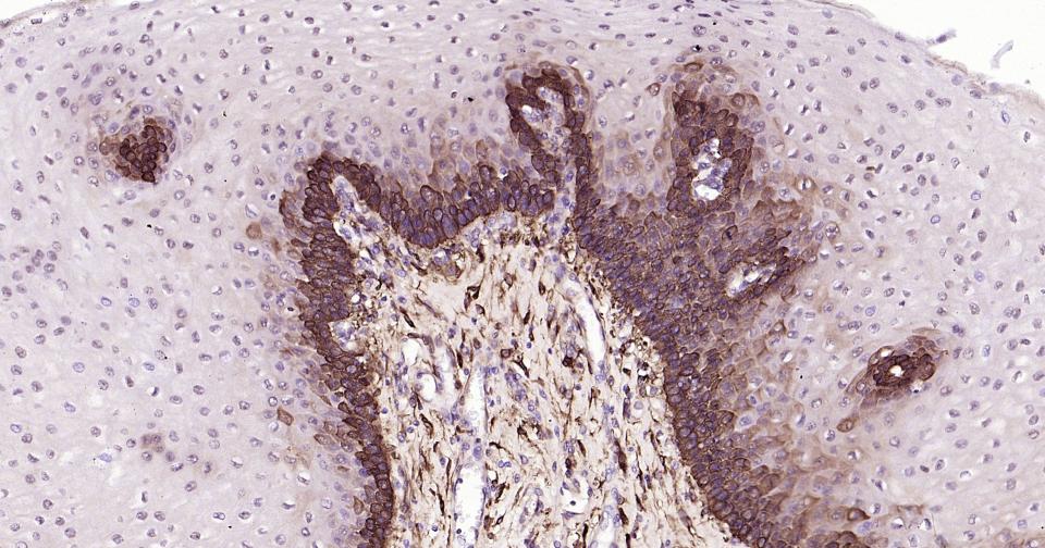 Paraformaldehyde-fixed, paraffin embedded Human Esophagus; Antigen retrieval by boiling in sodium citrate buffer (pH6.0) for 15 min; Antibody incubation with CCR-2 Monoclonal Antibody, Unconjugated(bsm-62473R) at 1:200 overnight at 4°C, followed by conjugation to the bs-0295G-HRP and DAB (C-0010) staining.