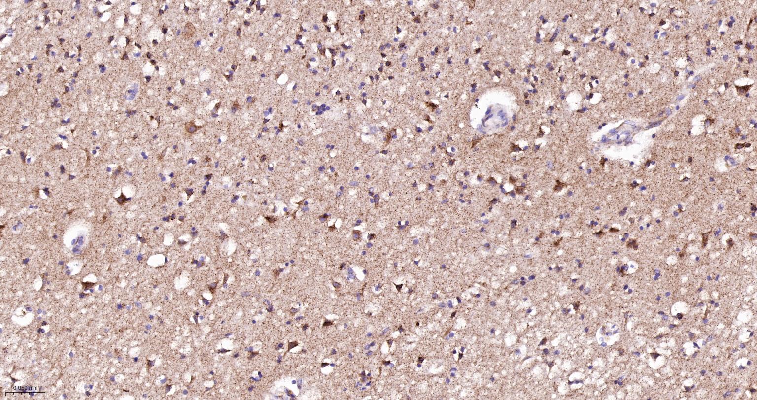 Paraformaldehyde-fixed, paraffin embedded Human Left Parietal Lobe; Antigen retrieval by boiling in sodium citrate buffer (pH6.0) for 15 min; The section was incubated with KLK8 Monoclonal Antibody, Unconjugated (bsm-62551R) at 1:200 overnight at 4°C, followed by conjugation to the bs-0295G-HRP and DAB (C-0010) staining.