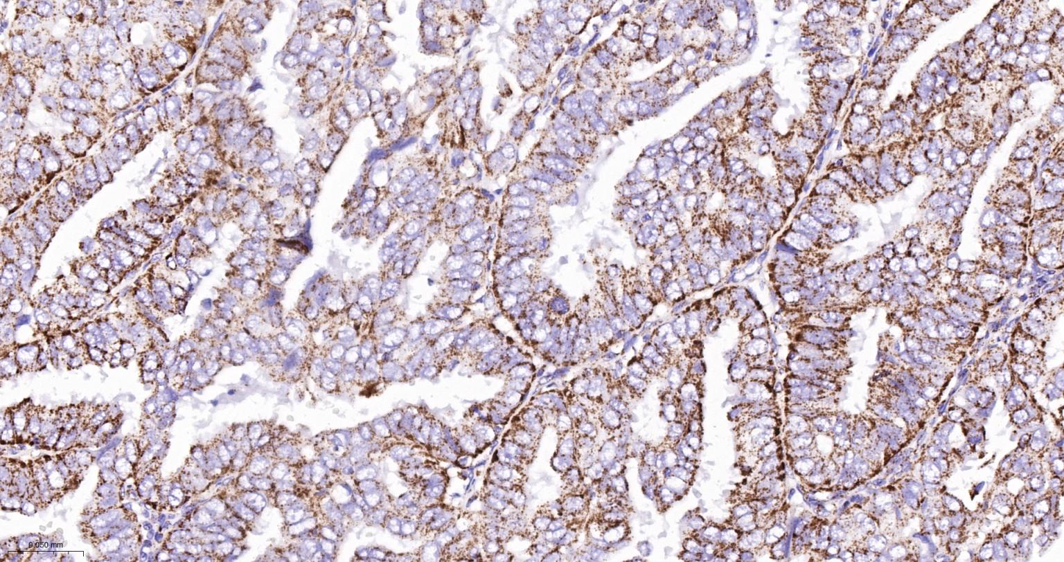 Paraformaldehyde-fixed, paraffin embedded Human Endometrial Cancer; Antigen retrieval by boiling in sodium citrate buffer (pH6.0) for 15 min; The section was incubated with KLK8 Monoclonal Antibody, Unconjugated (bsm-62551R) at 1:200 overnight at 4°C, followed by conjugation to the bs-0295G-HRP and DAB (C-0010) staining.