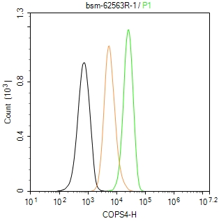 The SH-SY5Y (H) cells were fixed with 4% PFA (10 min at r.t.) and then permeabilized with 90% ice-cold methanol for 20 min at -20℃,the cells then were incubated in 5%BSA to block non-specific protein-protein interactions (30 min at r.t.), followed by secondary antibody incubation for 40 min at room temperature. Primary Antibody (green):Rabbit Anti-COPS4 antibody (bsm-62563R,1:100); Isotype Control (orange): Rabbit IgG (bs-0295P). Blank control (black): PBS. Acquisition of 20,000 events was performed.