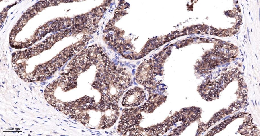 Paraformaldehyde-fixed, paraffin embedded Human Prostate Cancer; Antigen retrieval by boiling in sodium citrate buffer (pH6.0) for 15 min; The section was incubated with Bag1 Monoclonal Antibody, Unconjugated (bsm-62568R) at 1:200 overnight at 4°C, followed by conjugation to the bs-0295G-HRP and DAB (C-0010) staining.