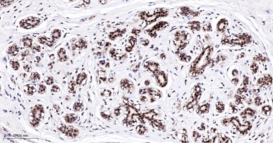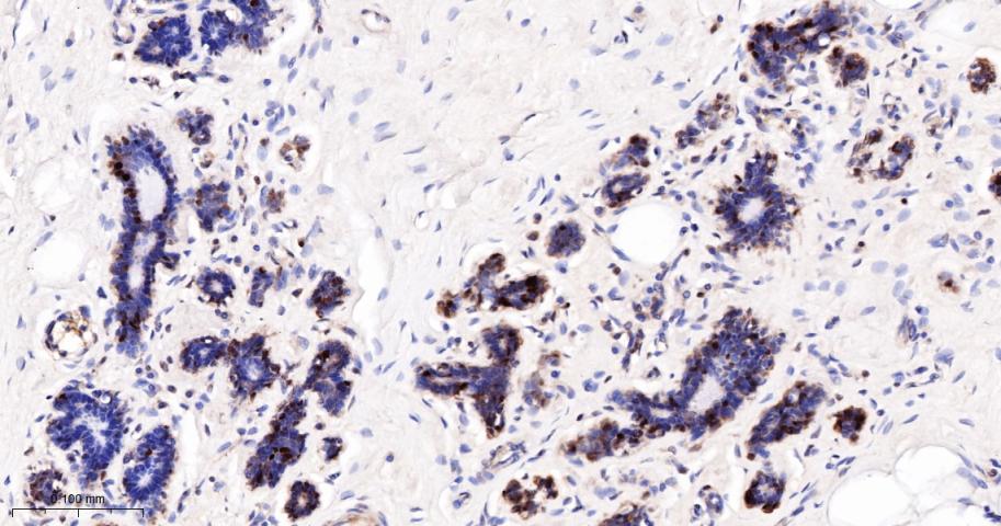Paraformaldehyde-fixed, paraffin embedded Human Breast; Antigen retrieval by boiling in sodium citrate buffer (pH6.0) for 15 min; The section was incubated with Bag1 Monoclonal Antibody, Unconjugated (bsm-62568R) at 1:200 overnight at 4°C, followed by conjugation to the bs-0295G-HRP and DAB (C-0010) staining.