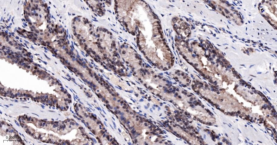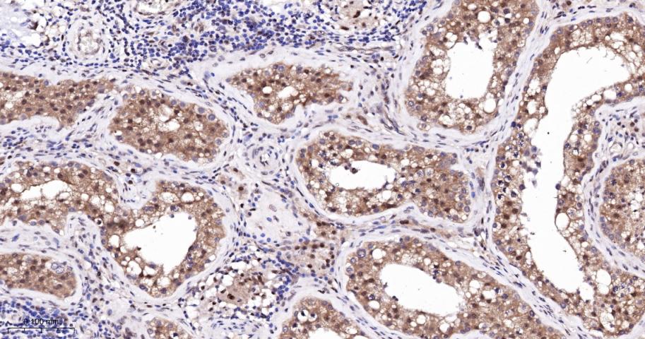 Paraformaldehyde-fixed, paraffin embedded Human Prostate; Antigen retrieval by boiling in sodium citrate buffer (pH6.0) for 15 min; The section was incubated with Bag1 Monoclonal Antibody, Unconjugated (bsm-62568R) at 1:200 overnight at 4°C, followed by conjugation to the bs-0295G-HRP and DAB (C-0010) staining.