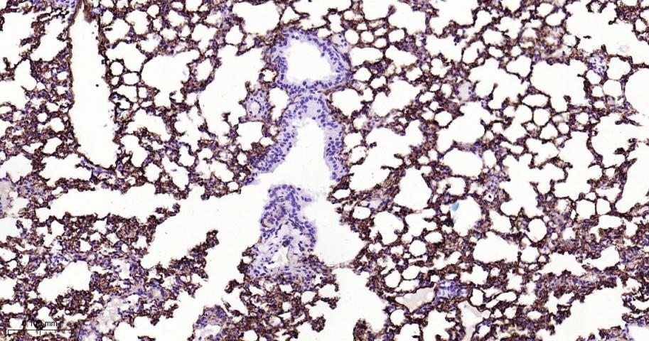 Paraformaldehyde-fixed, paraffin embedded Mouse Lung; Antigen retrieval by boiling in sodium citrate buffer (pH6.0) for 15 min; The section was incubated with Thrombomodulin Monoclonal Antibody, Unconjugated(bsm-62575R) at 1:200 overnight at 4°C, followed by conjugation to the bs-0295G-HRP and DAB (C-0010) staining.