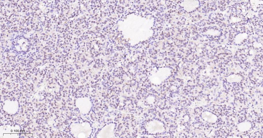 Paraformaldehyde-fixed, paraffin embedded Human Thyroid Cancer; Antigen retrieval by boiling in sodium citrate buffer (pH6.0) for 15 min; Antibody incubation with UFM1 Monoclonal Antibody, Unconjugated(bsm-62583R) at 1:200 overnight at 4°C, followed by conjugation to the bs-0295G-HRP and DAB (C-0010) staining.