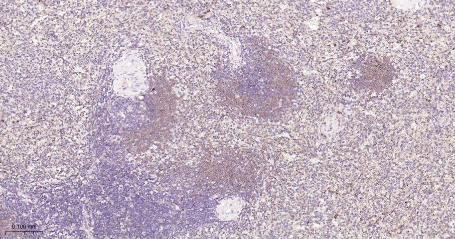 Paraformaldehyde-fixed, paraffin embedded Human Spleen; Antigen retrieval by boiling in sodium citrate buffer (pH6.0) for 15 min; Antibody incubation with UFM1 Monoclonal Antibody, Unconjugated(bsm-62583R) at 1:200 overnight at 4°C, followed by conjugation to the bs-0295G-HRP and DAB (C-0010) staining.