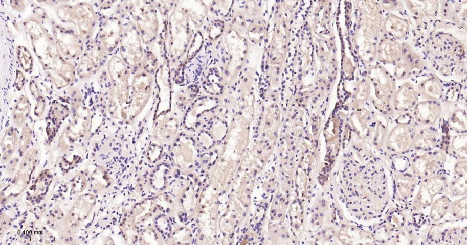 Paraformaldehyde-fixed, paraffin embedded Human Kidney; Antigen retrieval by boiling in sodium citrate buffer (pH6.0) for 15 min; Antibody incubation with UFM1 Monoclonal Antibody, Unconjugated(bsm-62583R) at 1:200 overnight at 4°C, followed by conjugation to the bs-0295G-HRP and DAB (C-0010) staining.