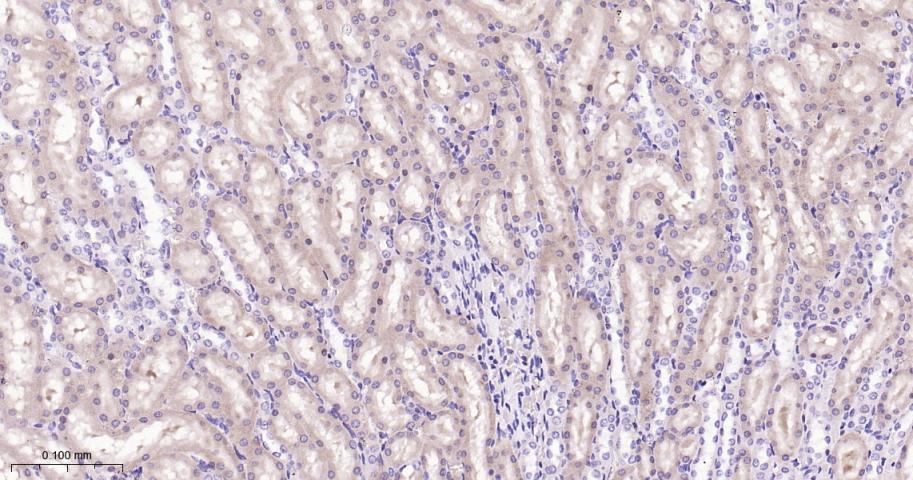 Paraformaldehyde-fixed, paraffin embedded Mouse Kidney; Antigen retrieval by boiling in sodium citrate buffer (pH6.0) for 15 min; Antibody incubation with UFM1 Monoclonal Antibody, Unconjugated(bsm-62583R) at 1:200 overnight at 4°C, followed by conjugation to the bs-0295G-HRP and DAB (C-0010) staining.