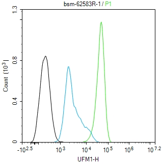 The HepG2 (H) cells were fixed with 4% PFA (10 min at r.t.) and then permeabilized with 90% ice-cold methanol for 20 min at -20℃,the cells then were incubated in 5%BSA to block non-specific protein-protein interactions (30 min at r.t.).Primary Antibody (green):Rabbit Anti-UFM1 antibody (bsm-62583R,1:100); Secondary Antibody (white blue): Goat anti-Rabbit IgG-BF488 (bs-60295G-BF488): 1 μg/test. Blank control (black): PBS. Acquisition of 20,000 events was performed.