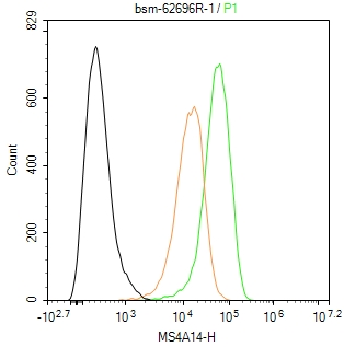 The THP-1 (H) cells were incubated in 5%BSA to block non-specific protein-protein interactions (30 min at r.t.) , followed by secondary antibody incubation for 40 min at room temperature. Primary Antibody (green): Rabbit Anti-MS4A14 antibody (bsm-62696R,1:100); Isotype Control (orange): Rabbit IgG (bs-0295P). Blank control (black): PBS. Acquisition of 20,000 events was performed.