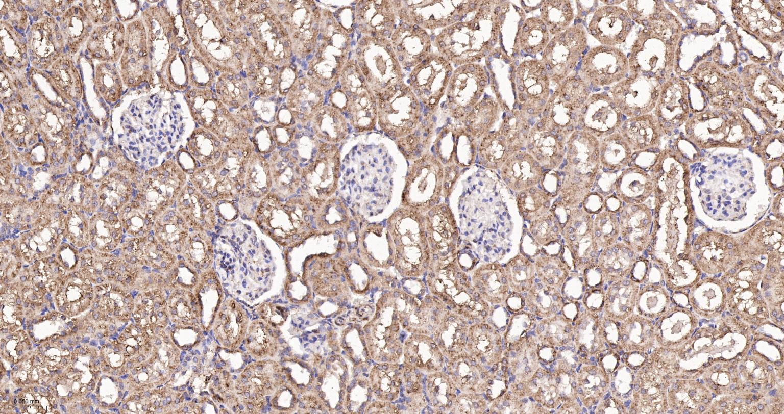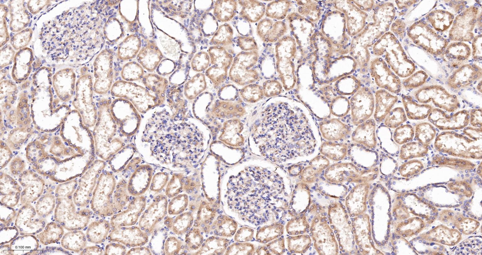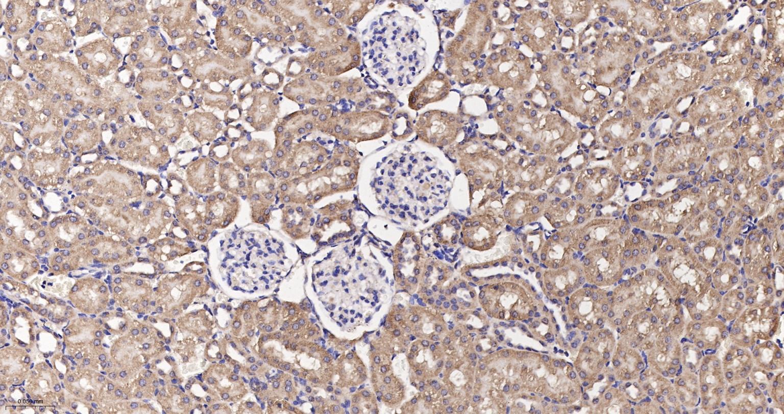Paraformaldehyde-fixed, paraffin embedded Mouse Kidney; Antigen retrieval by boiling in sodium citrate buffer (pH6.0) for 15 min; The section was incubated with ATE1 Monoclonal Antibody, Unconjugated (bsm-62759R) at 1:200 overnight at 4°C, followed by conjugation to the bs-0295G-HRP and DAB (C-0010) staining.