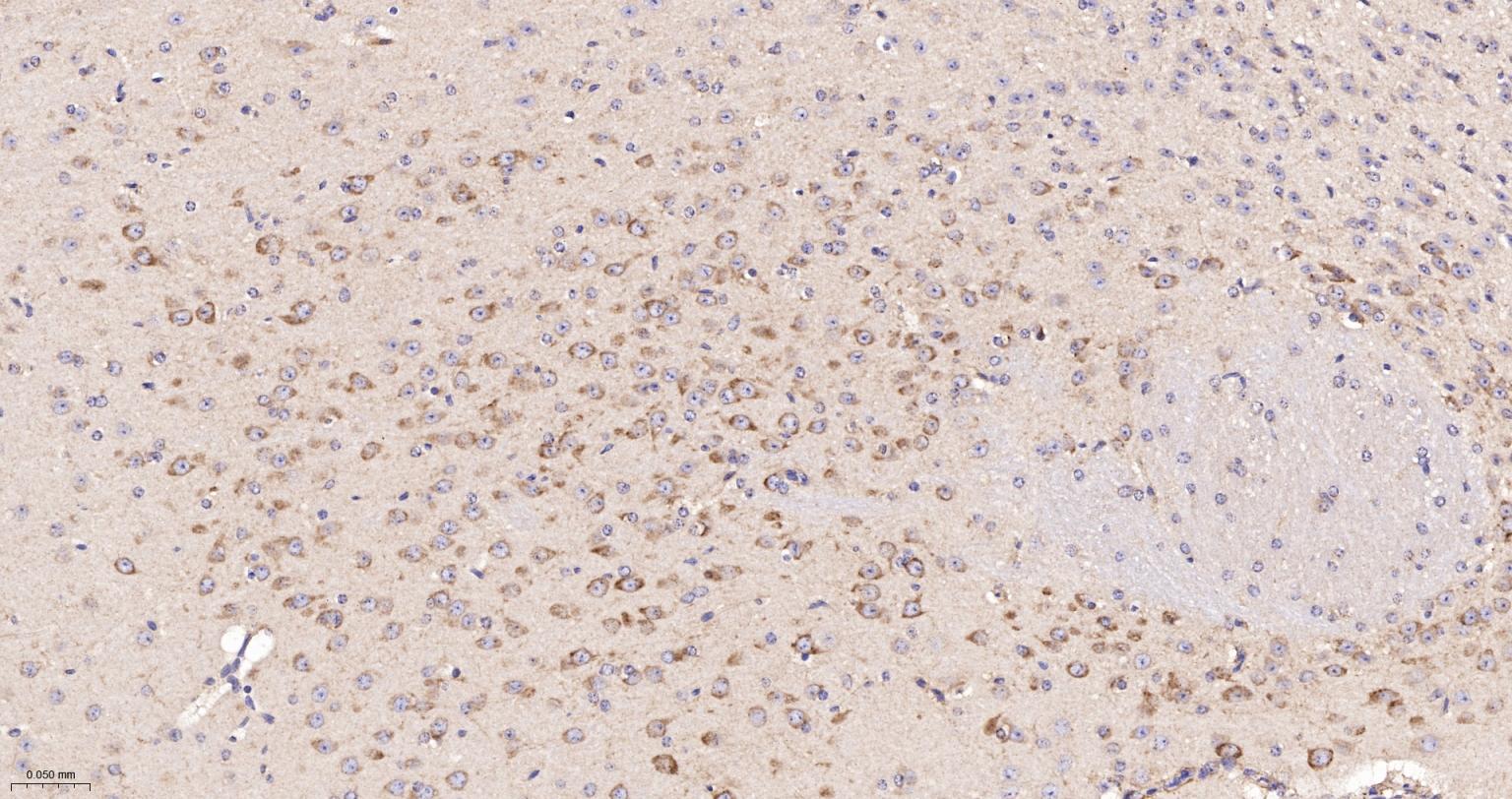 Paraformaldehyde-fixed, paraffin embedded Human Cerebrum; Antigen retrieval by boiling in sodium citrate buffer (pH6.0) for 15 min; The section was incubated with ATE1 Monoclonal Antibody, Unconjugated (bsm-62759R) at 1:200 overnight at 4°C, followed by conjugation to the bs-0295G-HRP and DAB (C-0010) staining.