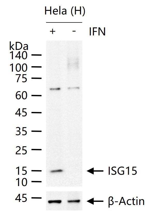 Hela (H) cells were treated with or without IFN (1000 U/mL) for 24 h, 25 μg total protein per lane of cell lysates (see on figure) probed with ISG15 monoclonal antibody, unconjugated (bsm-62839R) at 1:1000 dilution and 4°C overnight incubation. Followed by conjugated secondary antibody incubation at r.t. for 60 min.