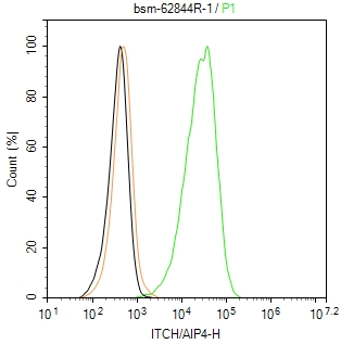 The Raji (H) cells were incubated in 5%BSA to block non-specific protein-protein interactions (30 min at r.t.) , followed by secondary antibody incubation for 40 min at room temperature. Primary Antibody (green): Rabbit Anti-ITCH/AIP4 antibody (bs-62844R,1:100); Isotype Control (orange): Rabbit IgG (bs-0295P). Blank control (black): PBS. Acquisition of 20,000 events was performed.