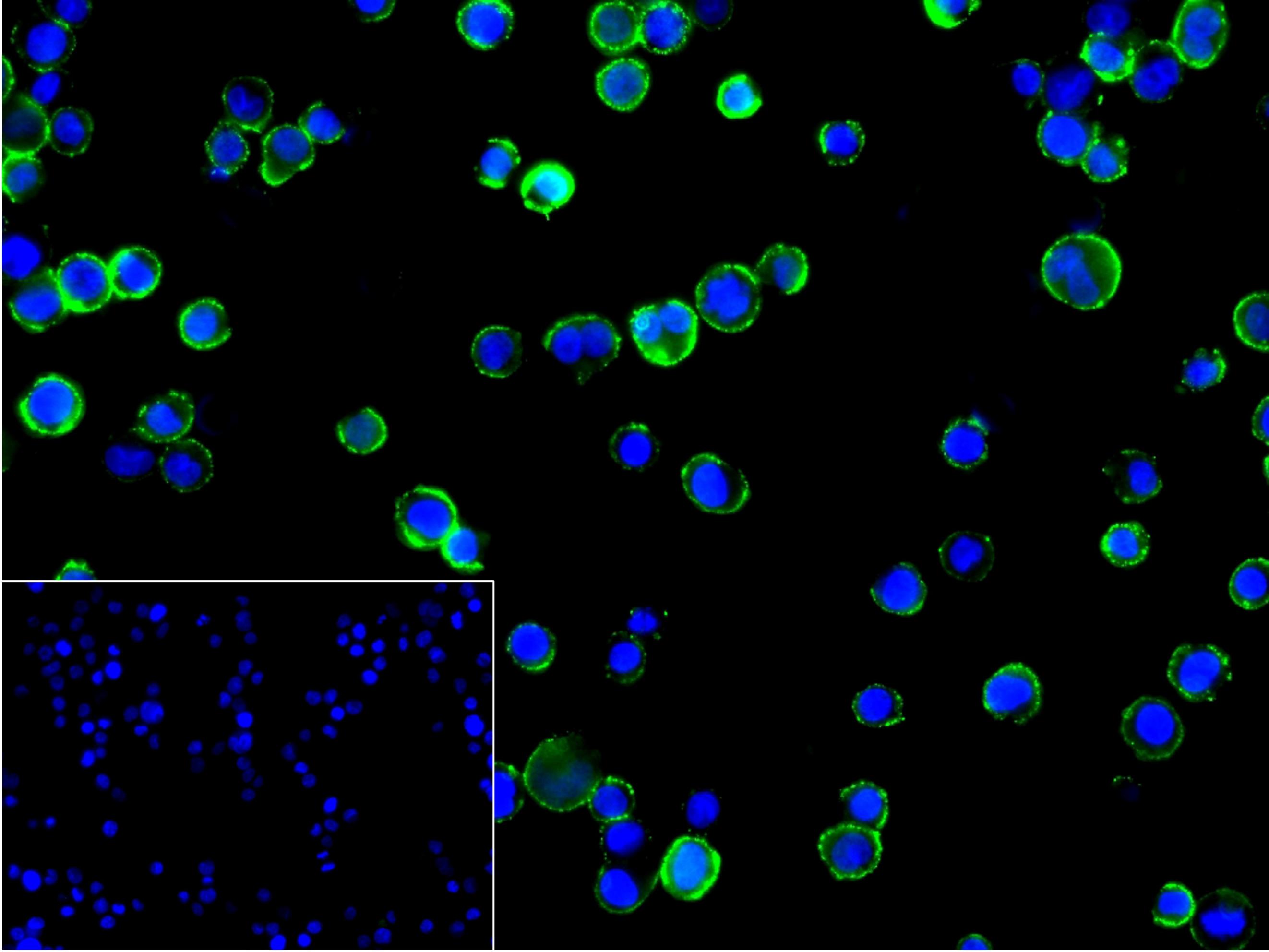 4% Paraformaldehyde-fixed Raji (H) cell; Antibody incubation with (ITCH/AIP4) monoclonal Antibody, unconjugated (bsm-62844R) 1:100, 90 min at 37°C; followed by conjugated Goat Anti-Rabbit IgG antibody (green, bs-60295G-BF488) at 37°C for 90 min, DAPI (blue, C02-04002) was used to stain the cell nuclei. PBS instead of the primary antibody was used as the blank control.