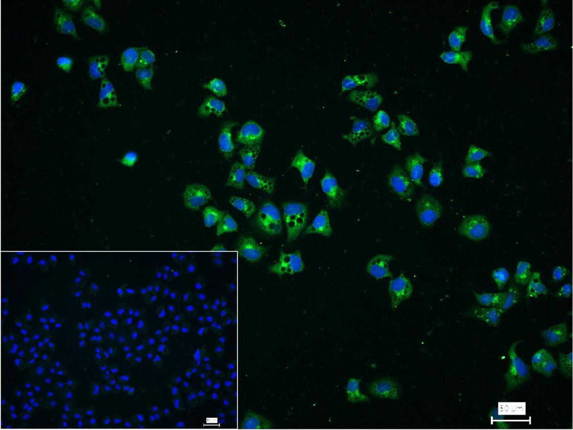 4% Paraformaldehyde-fixed Hela(H) cell; Triton X-100 at r.t. for 20 min; Antibody incubation with (LC3A) monoclonal Antibody, unconjugated (bsm-62899R) 1:100, 90 min at 37°C; followed by conjugated Goat Anti-Rabbit IgG antibody (green, bs-60295G-FITC) at 37°C for 90 min, DAPI (blue, C02-04002) was used to stain the cell nuclei. PBS instead of the primary antibody was used as the blank control.