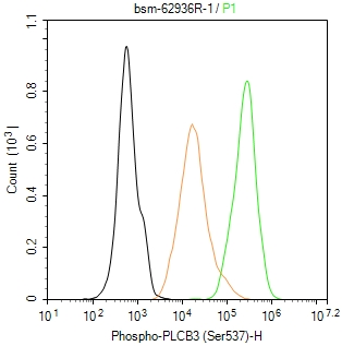 The Hela (treated with anisomycin (20μg/ml for 15min)) (H) cells were fixed with 4% PFA (10 min at r.t.) and then permeabilized with 90% ice-cold methanol for 20 min at -20℃,the cells then were incubated in 5%BSA to block non-specific protein-protein interactions (30 min at r.t.), followed by secondary antibody incubation for 40 min at room temperature. Primary Antibody (green):Rabbit Anti-Phospho-PLCB3 (Ser537) antibody (bsm-62936R,1:100); Isotype Control (orange): Rabbit IgG (bs-0295P). Blank control (black): PBS. Acquisition of 20,000 events was performed.