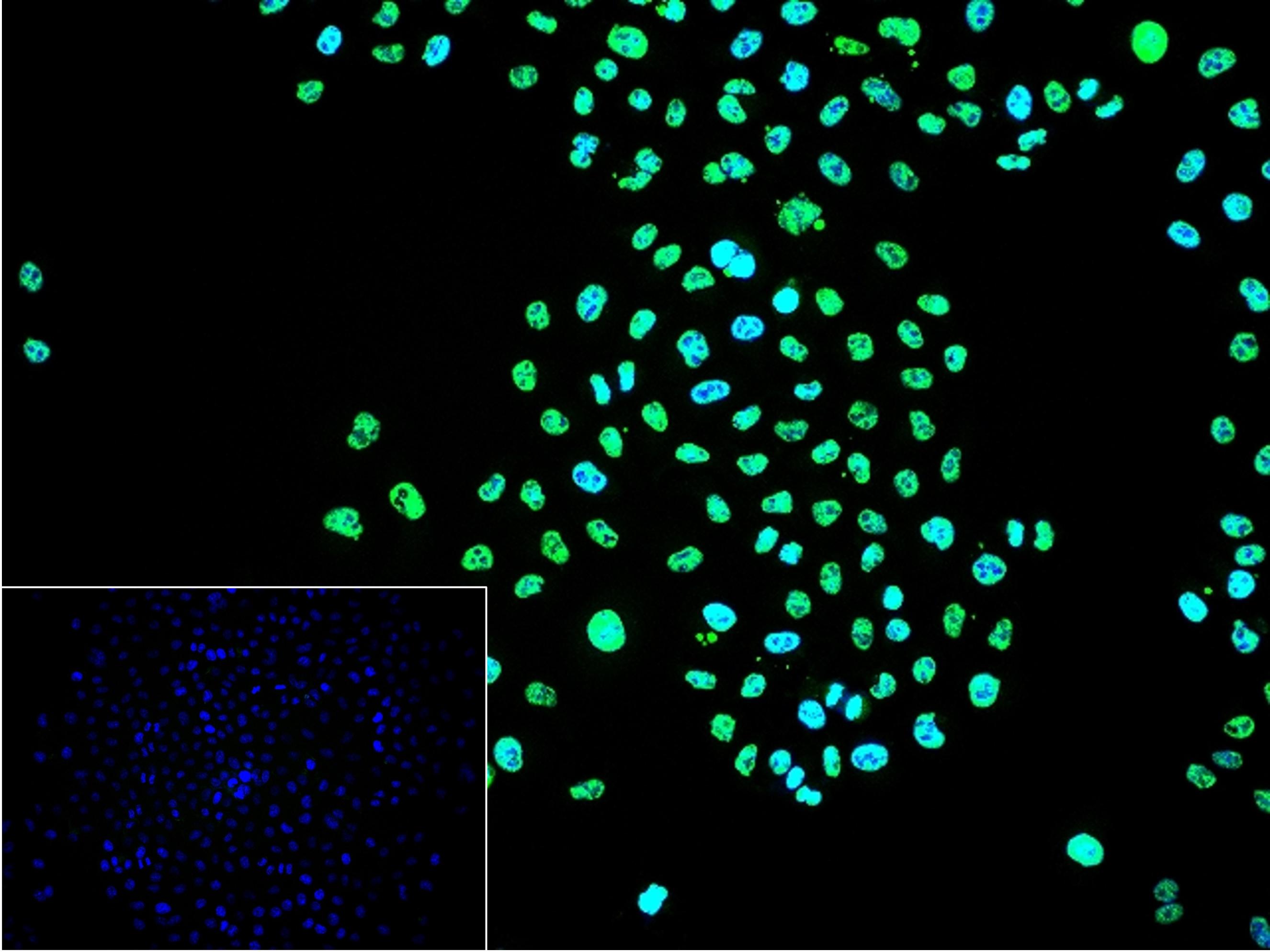 4% Paraformaldehyde-fixed Hela (treated with anisomycin (20μg/ml for 15min)) (H) cell; Triton X-100 at r.t. for 20 min; Antibody incubation with (Phospho-PLCB3 (Ser537)) monoclonal Antibody, unconjugated (bsm-62936R) 1:100, 90 min at 37°C; followed by conjugated Goat Anti-Rabbit IgG antibody (green, bs-60295G-BF488) at 37°C for 90 min, DAPI (blue, C02-04002) was used to stain the cell nuclei. PBS instead of the primary antibody was used as the blank control.