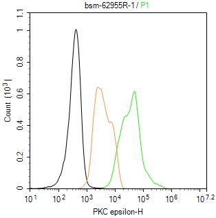 The SH-SY5Y (H) cells were fixed with 4% PFA (10 min at r.t.) and then permeabilized with 90% ice-cold methanol for 20 min at -20℃,the cells then were incubated in 5%BSA to block non-specific protein-protein interactions (30 min at r.t.), followed by secondary antibody incubation for 40 min at room temperature. Primary Antibody (green):Rabbit Anti-PKC epsilon antibody (bsm-62955R,1:1400); Isotype Control (orange): Rabbit IgG (bs-0295P). Blank control (black): PBS. Acquisition of 20,000 events was performed.