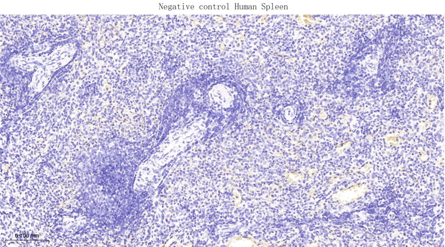(Negative control) Paraformaldehyde-fixed, paraffin embedded Human Spleen; Antigen retrieval by boiling in sodium citrate buffer (pH6.0) for 15 min; The section was incubated with SNAP25 Monoclonal Antibody, Unconjugated (bsm-62983R) at 1:200 overnight at 4°C, followed by conjugation to the bs-0295G-HRP and DAB (C-0010) staining.