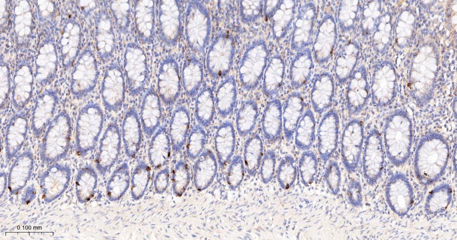 Paraformaldehyde-fixed, paraffin embedded Human Colon; Antigen retrieval by boiling in sodium citrate buffer (pH6.0) for 15 min; The section was incubated with TIMP-1 Monoclonal Antibody, Unconjugated (bsm-62994R) at 1:500 overnight at 4°C, followed by conjugation to the bs-0295G-HRP and DAB (C-0010) staining.