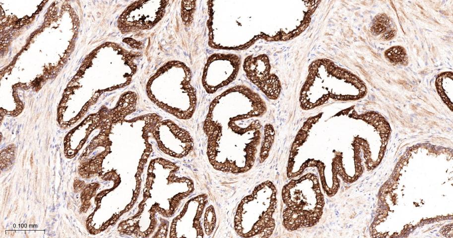 Paraformaldehyde-fixed, paraffin embedded Human Prostate Tumor; Antigen retrieval by boiling in sodium citrate buffer (pH6.0) for 15 min; The section was incubated with TIMP-1 Monoclonal Antibody, Unconjugated (bsm-62994R) at 1:200 overnight at 4°C, followed by conjugation to the bs-0295G-HRP and DAB (C-0010) staining.