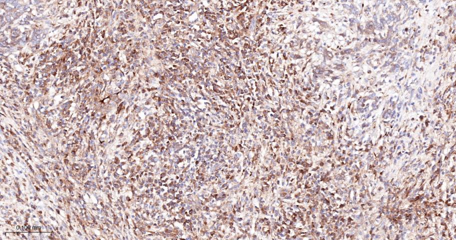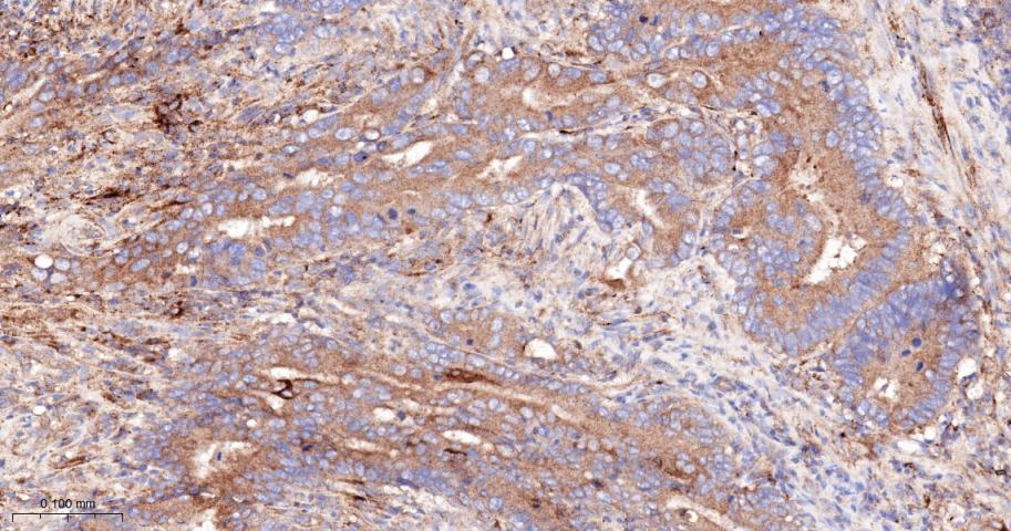 Paraformaldehyde-fixed, paraffin embedded Human Colon Cancer; Antigen retrieval by boiling in sodium citrate buffer (pH6.0) for 15 min; The section was incubated with TIMP-1 Monoclonal Antibody, Unconjugated (bsm-62994R) at 1:500 overnight at 4°C, followed by conjugation to the bs-0295G-HRP and DAB (C-0010) staining.