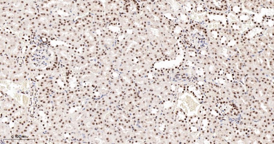 Paraformaldehyde-fixed, paraffin embedded Rat Kidney; Antigen retrieval by boiling in sodium citrate buffer (pH6.0) for 15 min; The section was incubated with TRIM28 Monoclonal Antibody, Unconjugated (bsm-63000R) at 1:200 overnight at 4°C, followed by conjugation to the bs-0295G-HRP and DAB (C-0010) staining.
