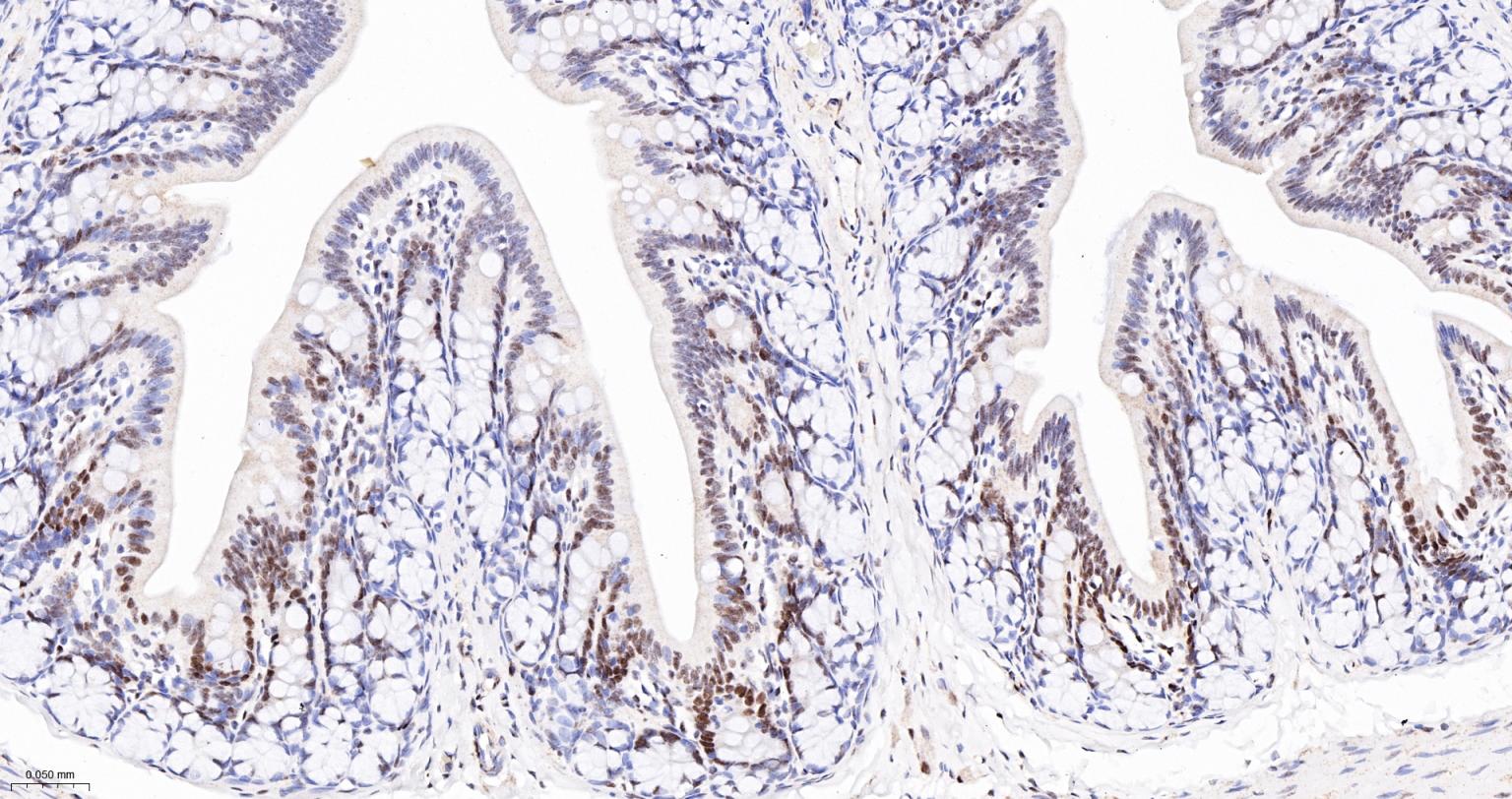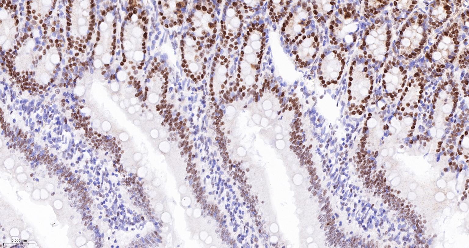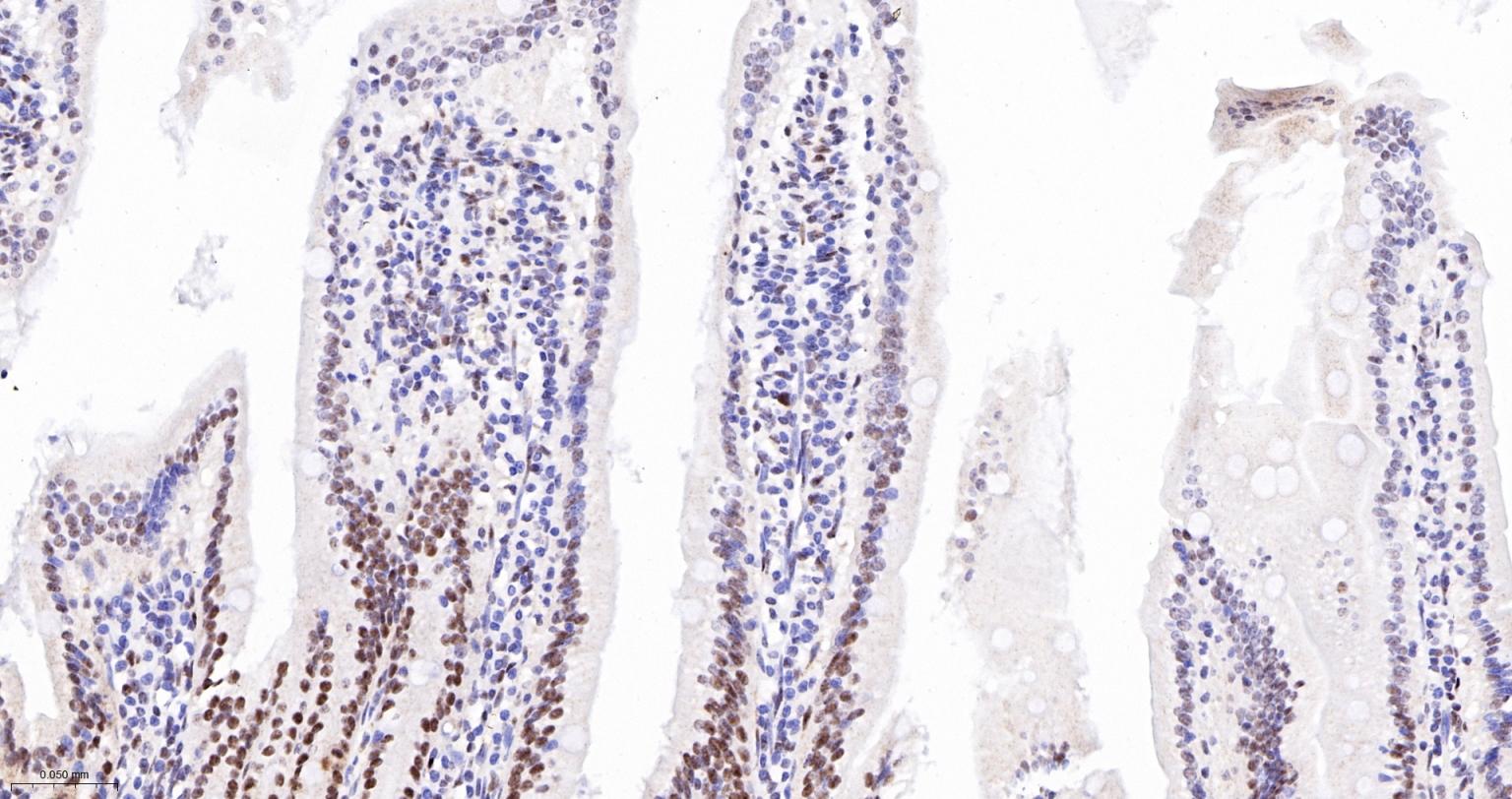 Paraformaldehyde-fixed, paraffin embedded Rat Small Intestine; Antigen retrieval by boiling in sodium citrate buffer (pH6.0) for 15 min; The section was incubated with phospho-UBF1(Ser484) Monoclonal Antibody, Unconjugated (bsm-63010R) at 1:200 overnight at 4°C, followed by conjugation to the bs-0295G-HRP and DAB (C-0010) staining.