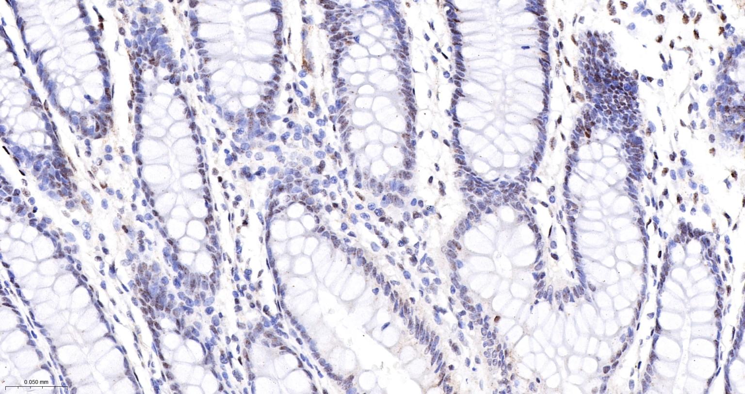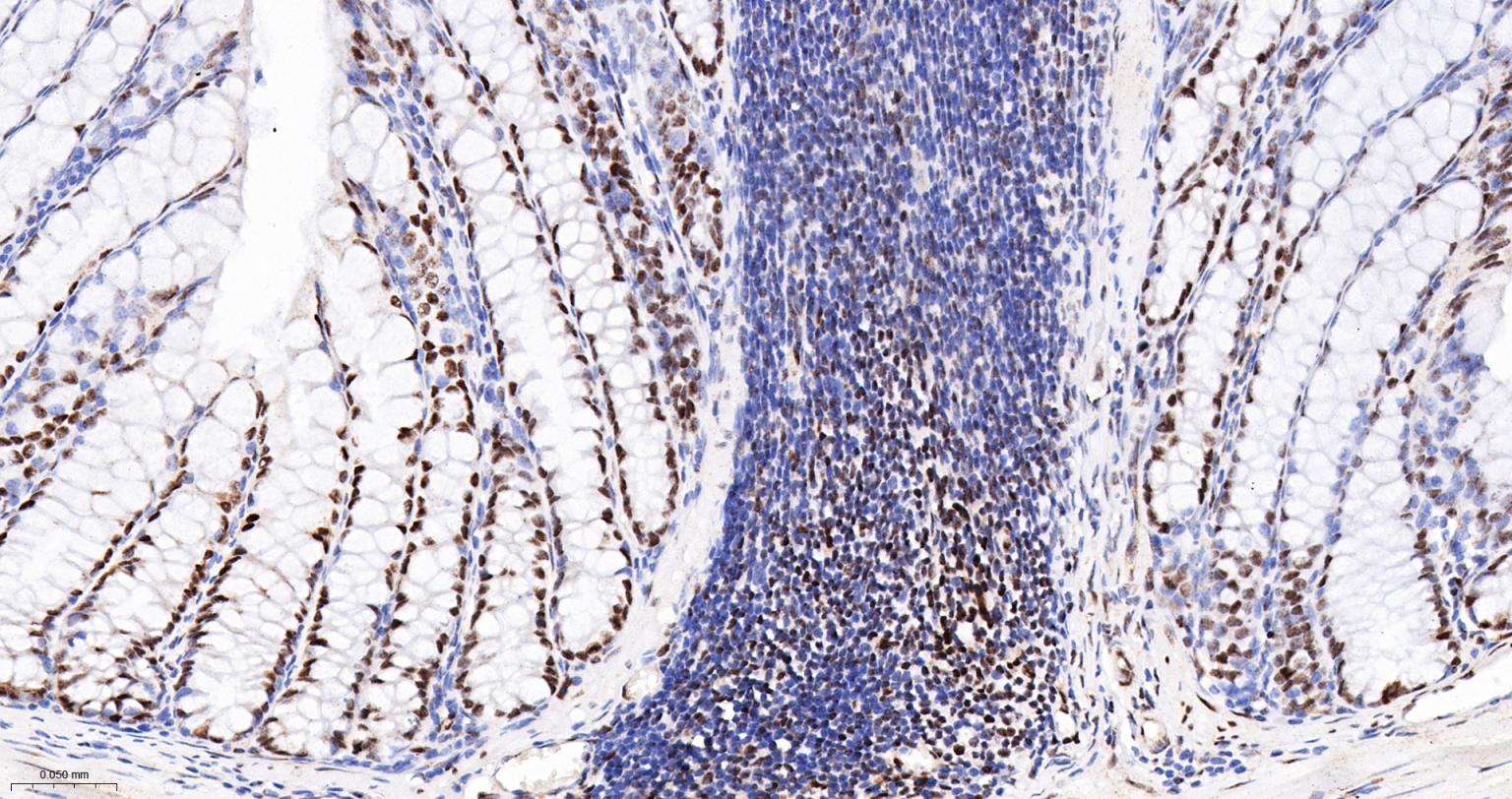 Paraformaldehyde-fixed, paraffin embedded Mouse Colon; Antigen retrieval by boiling in sodium citrate buffer (pH6.0) for 15 min; The section was incubated with phospho-UBF1(Ser484) Monoclonal Antibody, Unconjugated (bsm-63010R) at 1:200 overnight at 4°C, followed by conjugation to the bs-0295G-HRP and DAB (C-0010) staining.