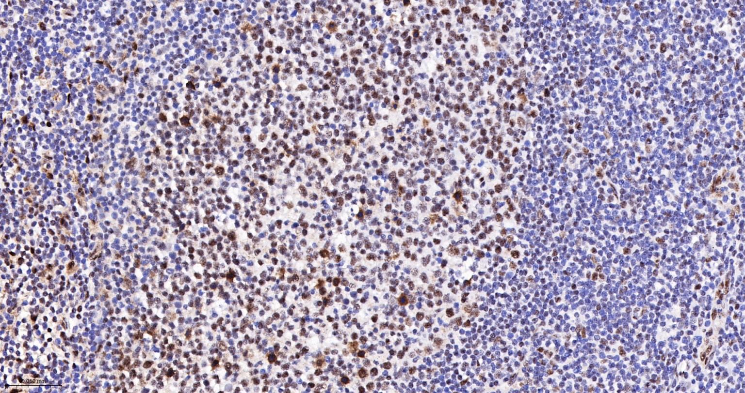 Paraformaldehyde-fixed, paraffin embedded Human Tonsil; Antigen retrieval by boiling in sodium citrate buffer (pH6.0) for 15 min; The section was incubated with phospho-UBF1(Ser484) Monoclonal Antibody, Unconjugated (bsm-63010R) at 1:200 overnight at 4°C, followed by conjugation to the bs-0295G-HRP and DAB (C-0010) staining.