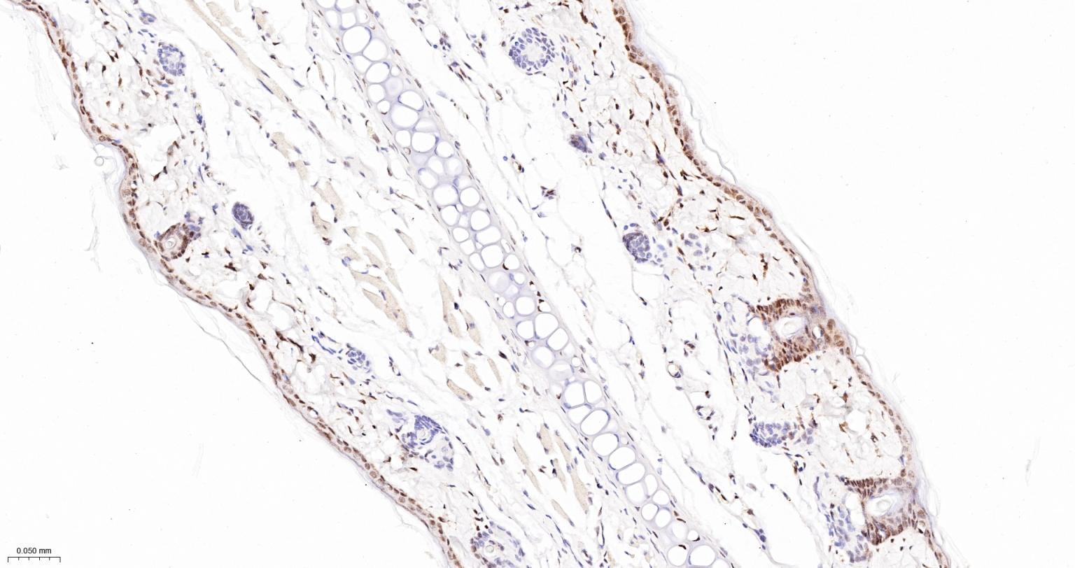 Paraformaldehyde-fixed, paraffin embedded Rat Skin; Antigen retrieval by boiling in sodium citrate buffer (pH6.0) for 15 min; The section was incubated with phospho-UBF1(Ser484) Monoclonal Antibody, Unconjugated (bsm-63010R) at 1:200 overnight at 4°C, followed by conjugation to the bs-0295G-HRP and DAB (C-0010) staining.