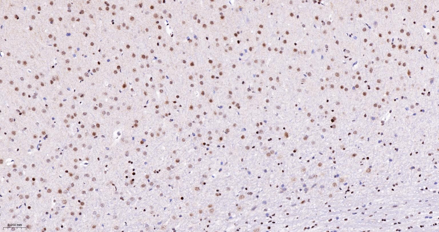 Paraformaldehyde-fixed, paraffin embedded Rat Cerebrum; Antigen retrieval by boiling in sodium citrate buffer (pH6.0) for 15 min; The section was incubated with phospho-UBF1(Ser484) Monoclonal Antibody, Unconjugated (bsm-63010R) at 1:200 overnight at 4°C, followed by conjugation to the bs-0295G-HRP and DAB (C-0010) staining.